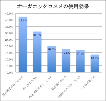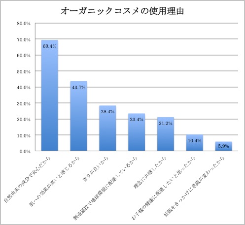 そこでオーガニックコスメ利用者のみにアンケートを行い、なぜオーガニックコスメを使っているのか、どんな効果があったのかを調べました。