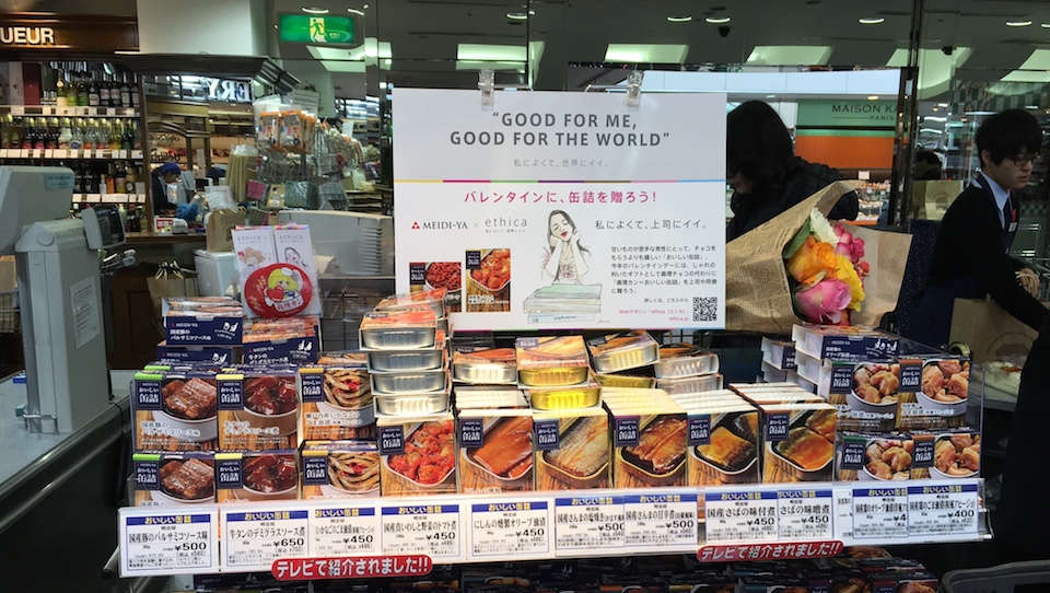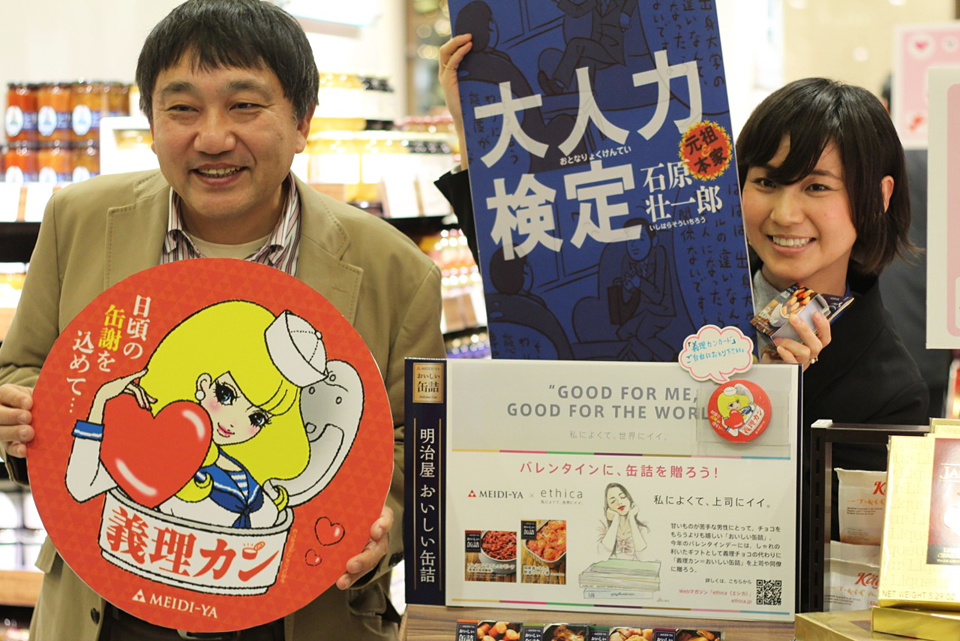 これは3日(水)から14日(日)までの期間中、明治屋が実施している「今年のバレンタインデーには、義理チョコの代わりにしゃれの利いたギフトとして『義理カン=おいしい缶詰』を上司や同僚に贈ろう」という提案キャンペーンの一環として開催したものです。
