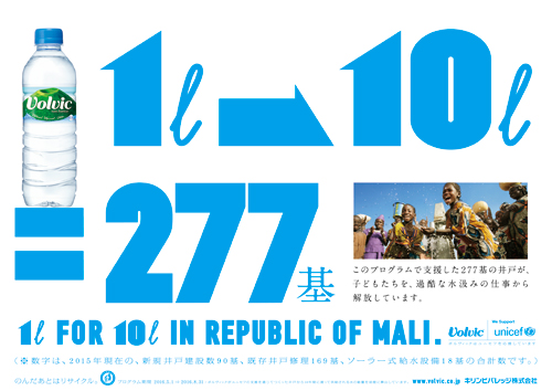 このプログラムは、キリンビバレッジが輸入・販売を行っているナチュラルミネラルウォーターブランド「ボルヴィック」が公益財団法人日本ユニセフ協会と協力してグローバルに展開している、清潔で安全な水の普及を目指すユニセフ支援活動の日本版です。日本のユーザーがボルヴィックを1ℓ購入すると、アフリカに住む人々に10ℓの清潔で安全な水が供給されるというもので、2005年のドイツを皮切りに2006年にはフランスで展開され、2007年からは日本での実施に至っています。