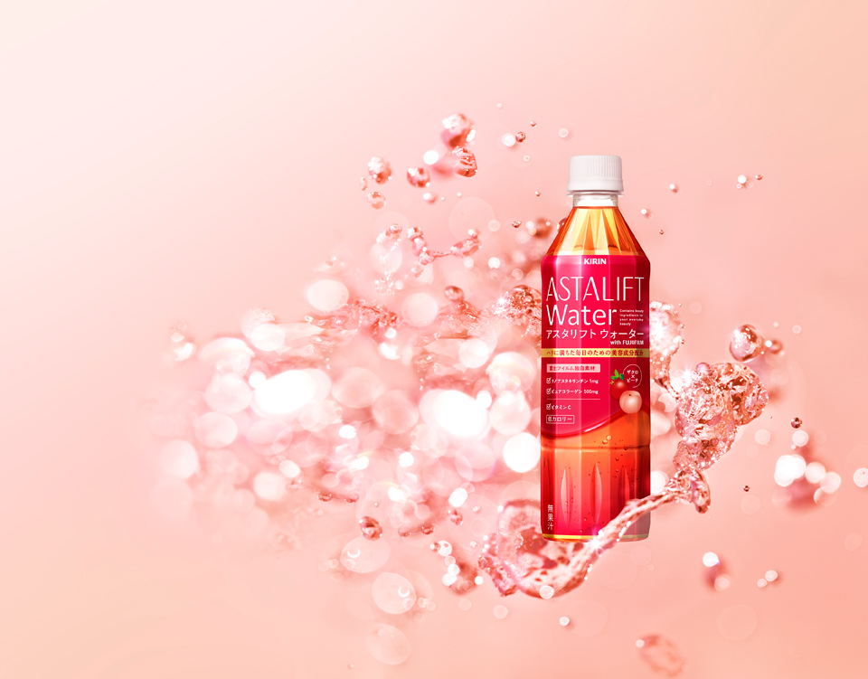 「キリン アスタリフト ウォーター」は、キリンビバレッジの“飲料化技術”と富士フイルムが写真フィルムで培った“ナノテクノロジー”を融合させることで、ユーザーに新しい価値を提供したいという思いから共同で開発したものです。忙しく時間に追われながらも、つねに美しくありたいと願う20代から40代の女性に向けた「シーンを選ばず手軽に飲めて、飽きが来ないおいしさの清涼飲料」を商品コンセプトに、約2年かけて開発しました。すっきりさわやかなザクロ×ピーチのフレーバーで、毎日飲んでも飽きがこないおいしさです。