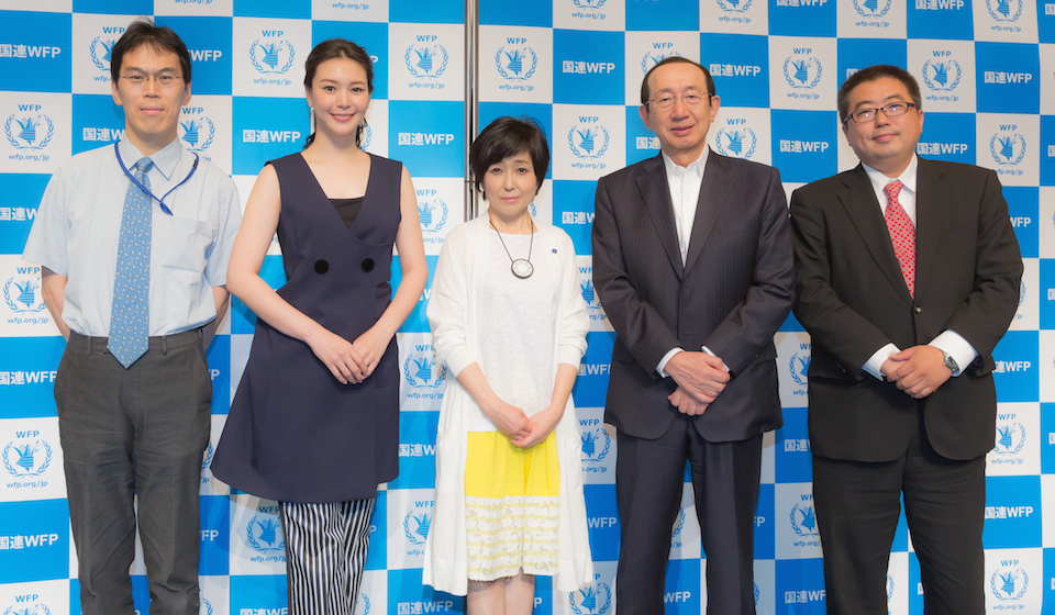 左から、外務省 国際協力局 緊急・人道支援課長 廣田司氏、国連WFP日本大使 知花くららさん、国連WFP協会親善大使 竹下景子さん、国連WFP協会 安藤宏基会長(日清食品ホールディングス代表取締役社長・CEO)、WFP国連世界食糧計画日本事務所代表代行 中井恒二郎氏  Photo=YUSUKE TAMURA (TRANSMEDIA)
