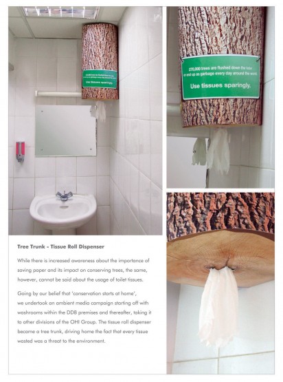 そんな行動を自然と踏みとどまらせるアンビエント・キャンペーンが行なわれました。紙を入れたホルダーが木の幹になっています。トイレで手を拭く紙1枚1枚を無駄にする行為が環境を脅かすと、人々にしっかり認識させます。
