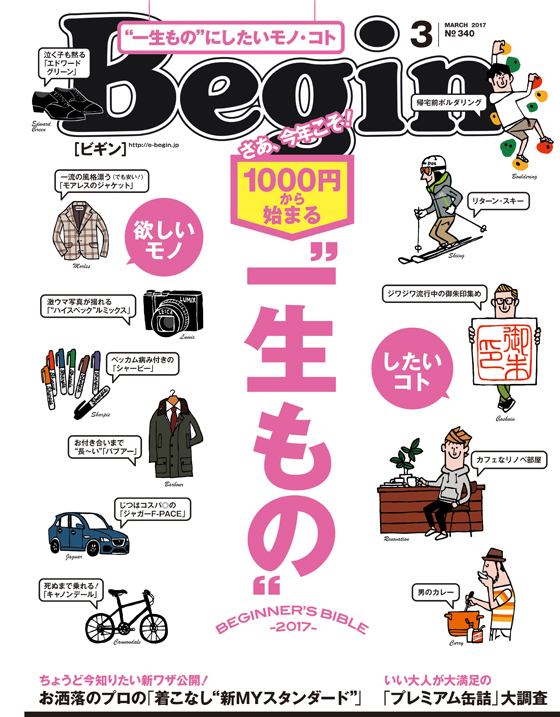 さて、今回ご紹介するのは今月刊行の、「こだわる男のモノ&ファッション」を紹介する男性誌『Begin』 3月号です。2017年を理想の自分へ近づく新しいステージにしたい人に向けたお役立ちTips満載の内容になっております。学生時代と同じモノ、同じ習慣で社会人生活を何年も過ごしている方、漠然と「カッコいいオトナになりたいなあ」と感じている方、必見です!