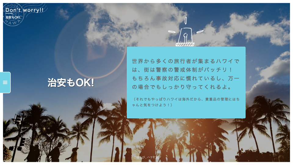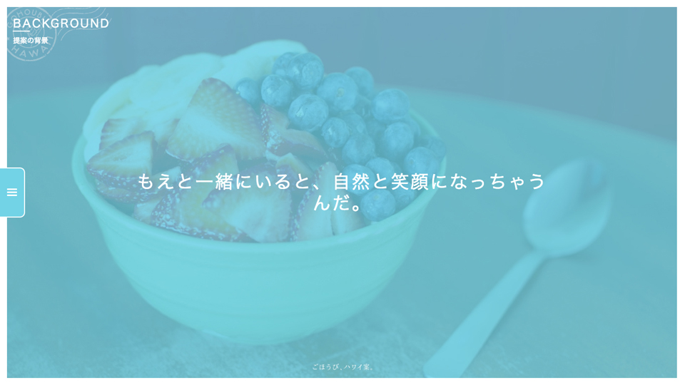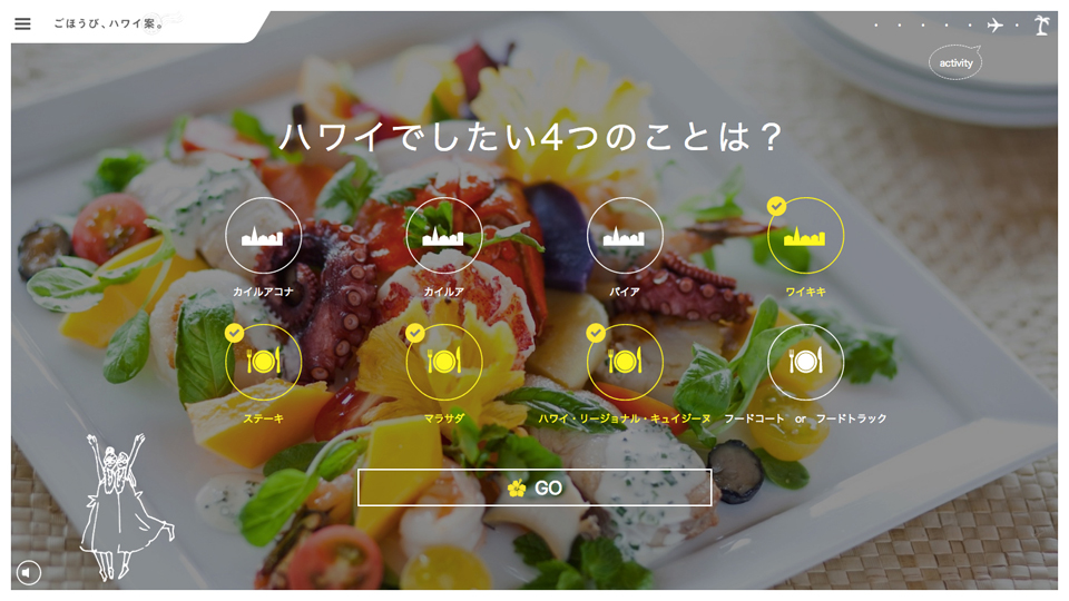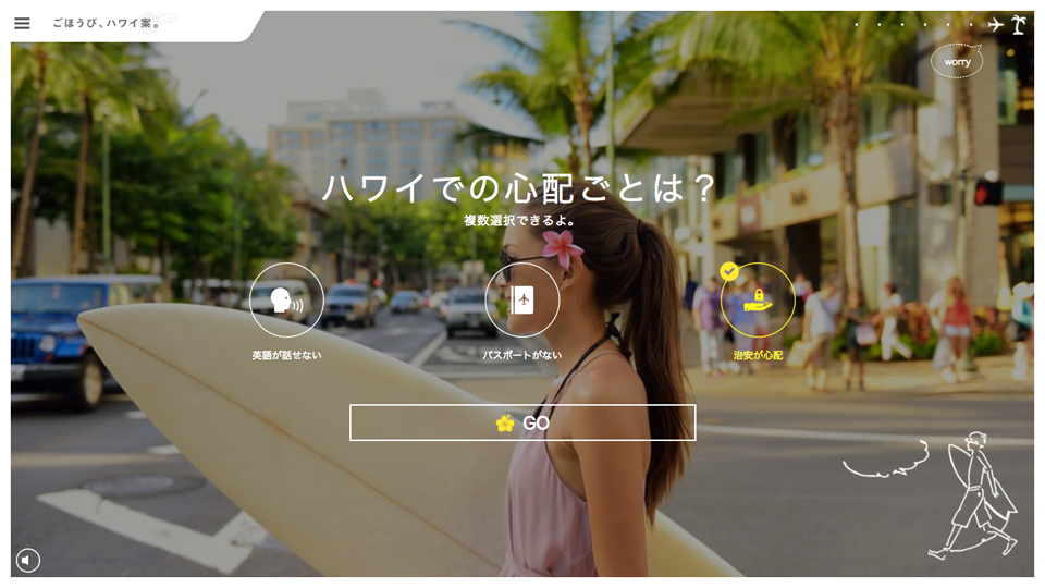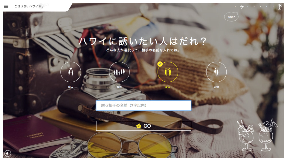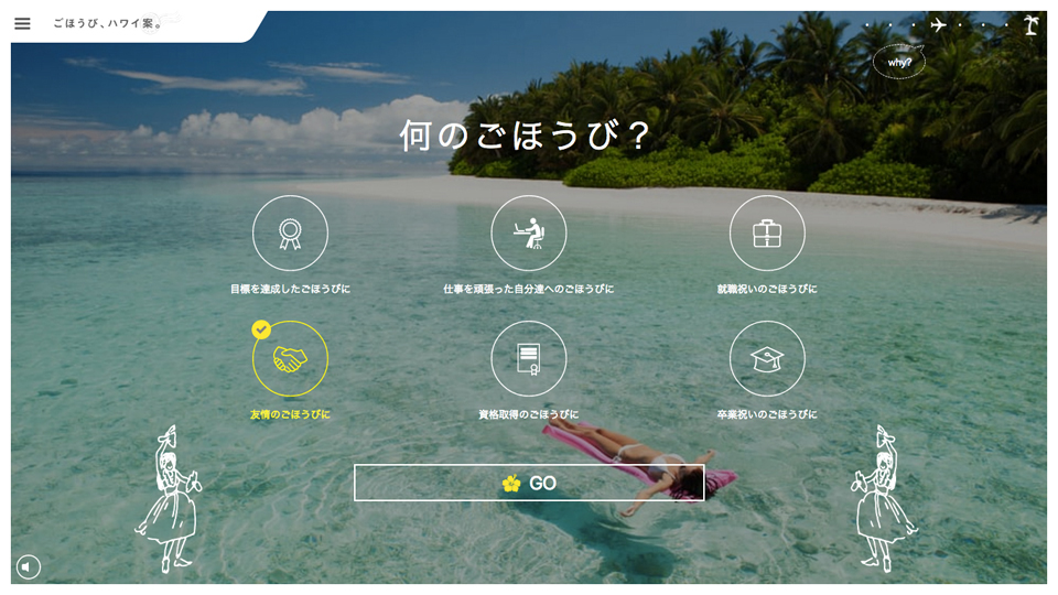 ハワイ州観光局が調べたところによると、ハワイへ訪れる旅行客の60%がリピーターなのだそうです。一度ハワイへ訪れたら、半数以上の人は必ずハワイの虜になってしまうということなのです。このたび同局は、まだハワイを知らない人に「一度目」のきっかけを提供するべく、514,080通りもの旅行プランからその人らしいハワイ旅行を計画できるシステム、『ごほうび、ハワイ。』を発表しました。これがなかなか簡単で、心あたたまるのです!