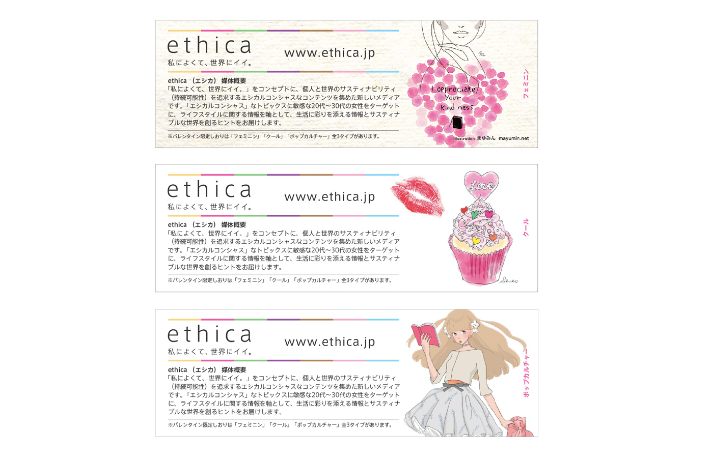 このほか、紀伊國屋書店新宿本店の7階にて『紀伊國屋書店×ethica』コラボレーションのバレンタイン限定しおりを1万枚無料配布致します。このしおりは、3名のイラストレーターによる「フェミニン」「クール」「ポップカルチャー」の3タイプが展開されます。