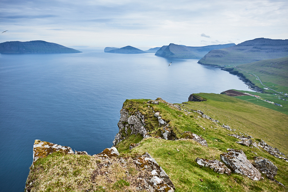 スペクタクルなパノラマの向こうに、西の離島、フグロイ島(Fugloy)とスヴィノイ島(Svínoy)を臨む。