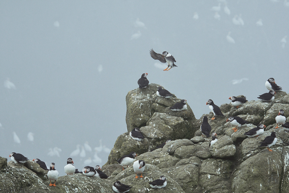 岩場に集うパフィン(ニシツノメドリ)、ガネット(シロカツオドリ)。
