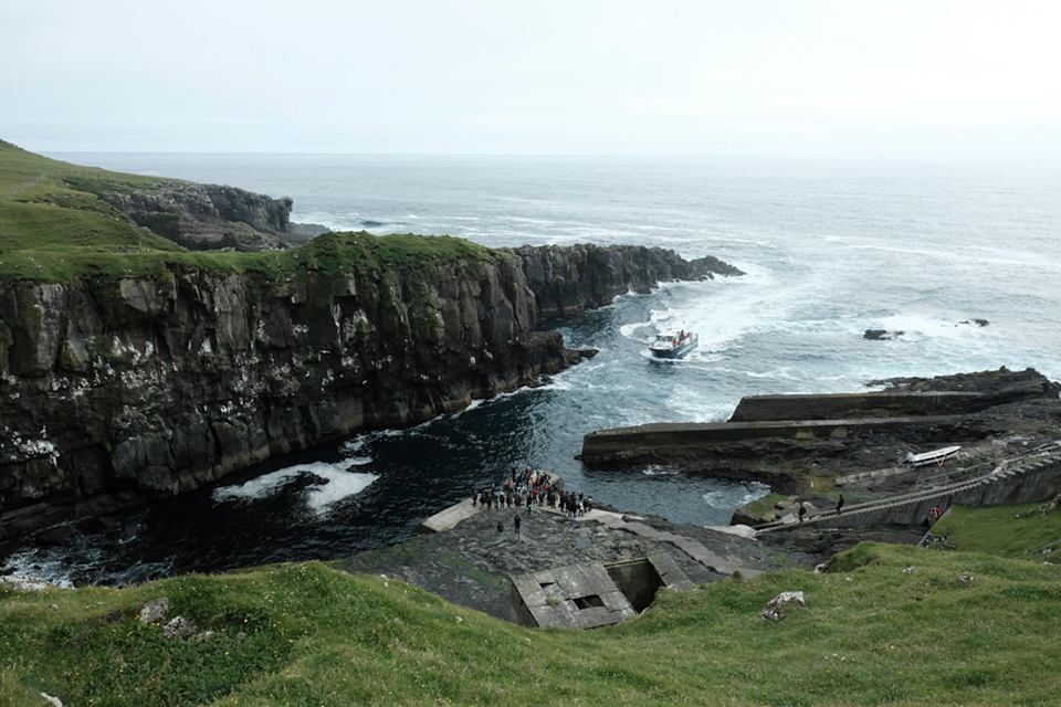 フェロー諸島には、崖に住む多くの海鳥が頭上を飛ぶ、天然の地勢の自然港が利用されていました。島々には波が打ち付けていましたが、壁のような崖の間の狭いスペースをスライドするようにターンして港に自在に出入りする船さばきに見惚れていました。
