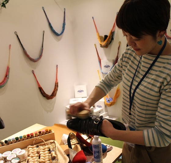 かなりエッジーなデザインのルームシューズやバッグが並ぶブランド。実はエシカルだった、というmade in Asakusaの靴ブランド。ディレクターの坂口さんの親戚だそうです。エコレザー、オーガニックコットン、リサイクルゴムなどを使っている、エシカルブランドですが、とにかくかっこいい!というラインナップでした。