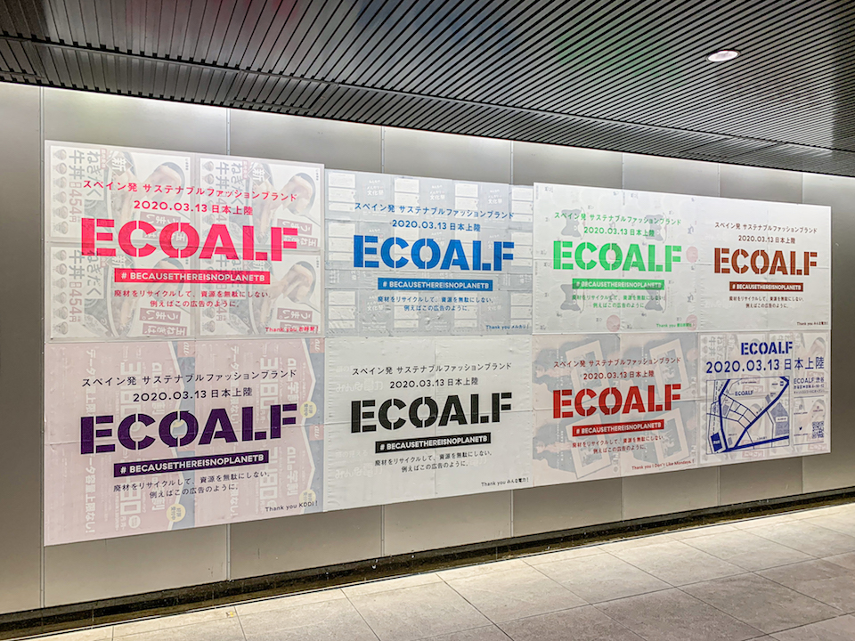 世界中で脱プラスチックの動きが広がる中、ペットボトルや魚網などの海洋プラスチックごみを再生して作った衣類や靴、かばんなどを次々に発表。現在ヨーロッパを中心に大きな注目を集めているスペイン生まれのファッションブランドが「ECOALF」です。この3月、日本第1号店が東京・渋谷にオープンしましたが、開店にあたり「地球の資源を無駄遣いしない」というブランドの思想を体現、他企業の掲出済み広告や廃棄予定の未使用ポスターなどを使って再利用したオープン告知広告を展開、大きな話題となりました。