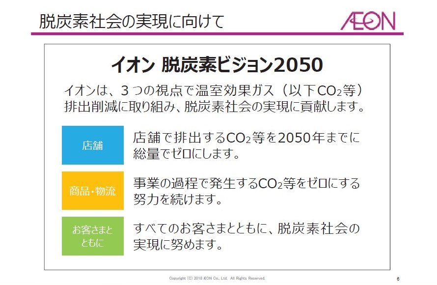 売上高で国内の小売業のトップを走り続けるイオン株式会社。1990年代から環境・社会貢献活動に取り組み、植樹活動や電子マネーを通じた地域貢献、再生エネルギーの導入など、多岐にわたる取り組みを展開しています。