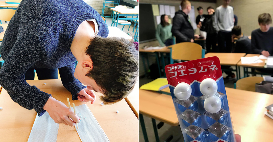 (左)お箸を使ったチーム対抗戦もしました (右)こちらは大人気だったフエラムネ!みんな興味深そうにずーっと吹いていました(笑)