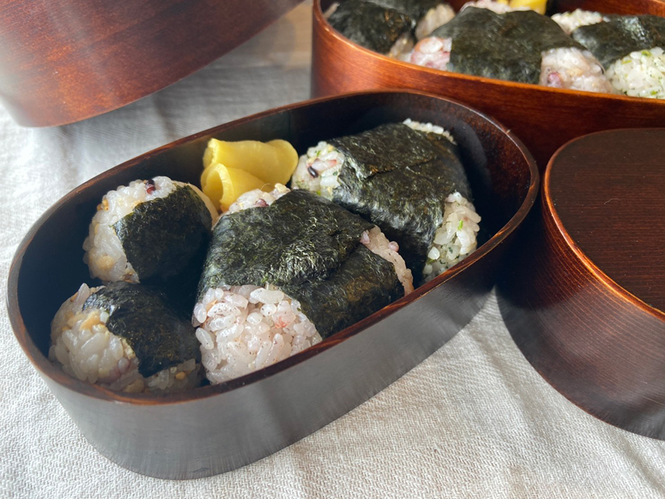 朝のうちに、お昼ごはん用のおにぎりをお弁当箱に詰めておく。