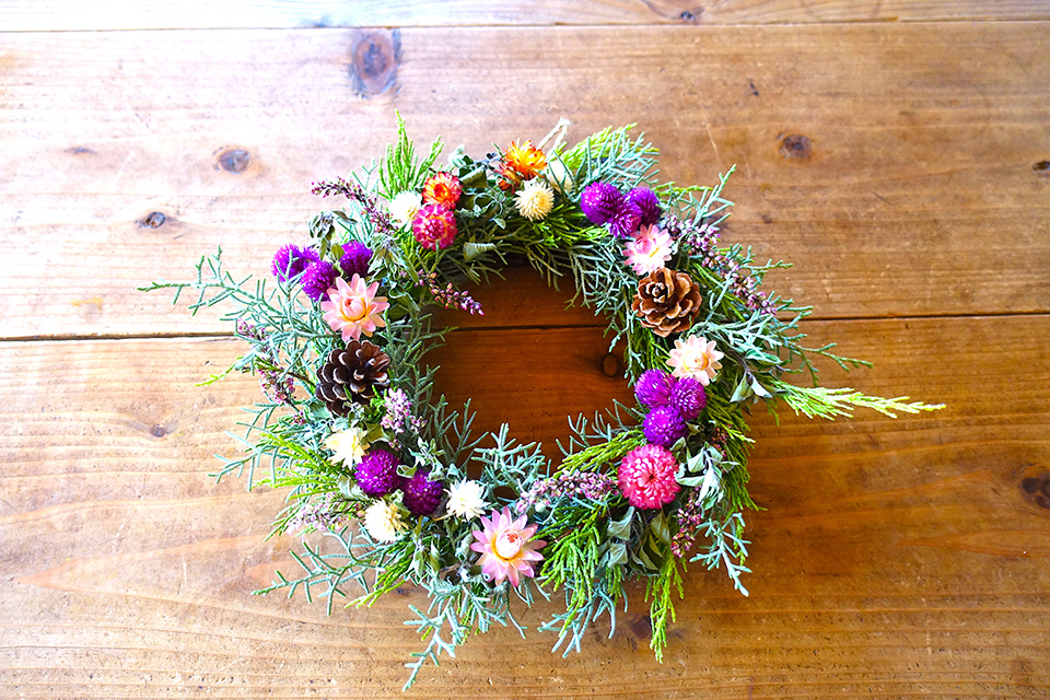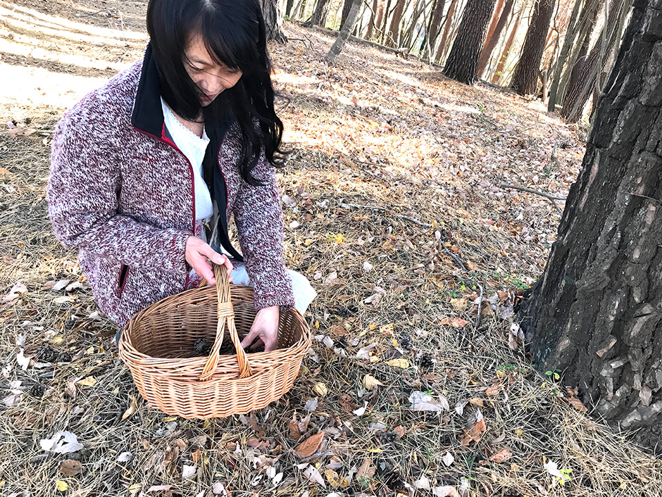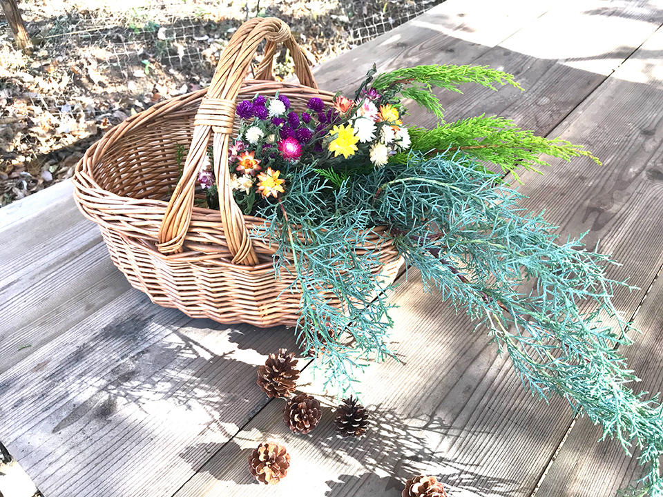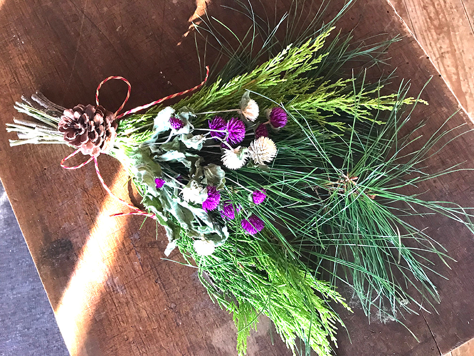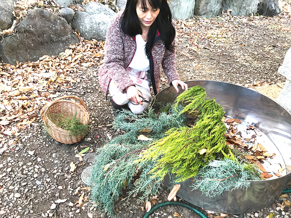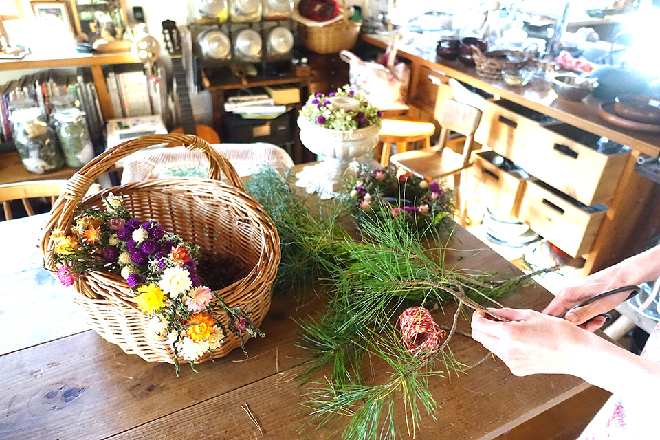 今回は、聖夜を間近に控えた四井さんのお宅にて、里山に自生する草木をベースにしたクリスマスリースの作り方を教えていただきます。みずみずしい常緑樹の葉と自家製ドライフラワーをミックスして作るオリジナルリースは、素朴で可憐な魅力に溢れています。