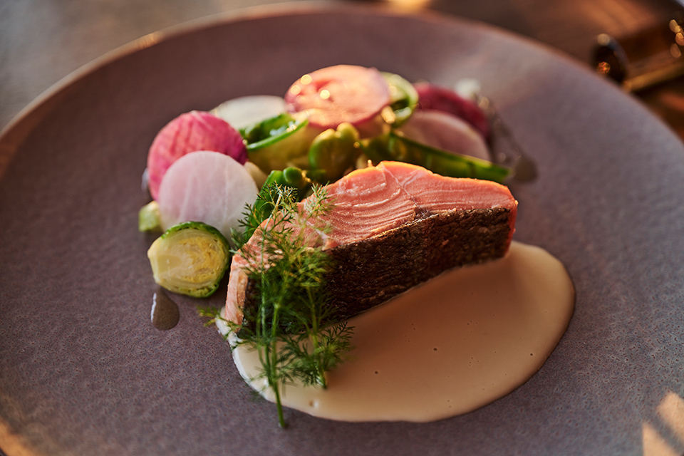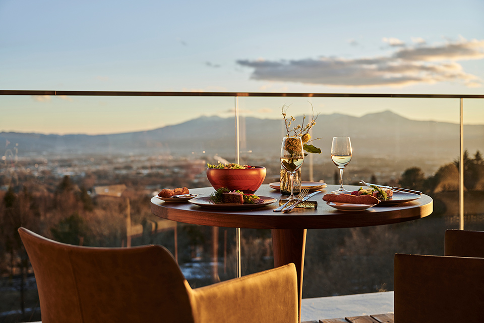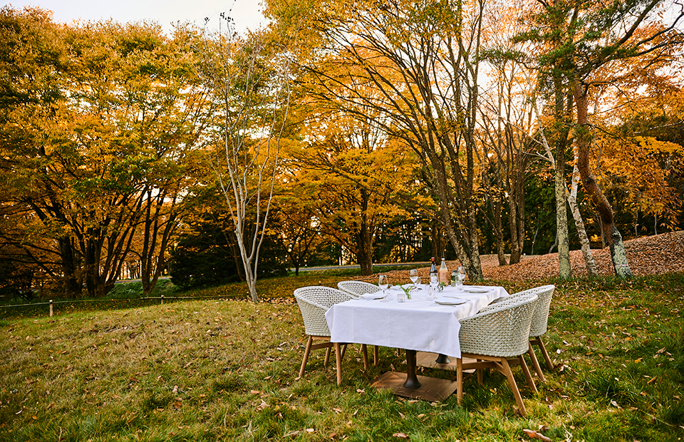 まずは、自然の恵みを提供する「Table Nature(ターブル ナチュール)」。御代田の風や空気を感じられる屋外空間で、特別な食体験の思い出を作ることができます。客室やダイニングのテラス、森の中のテーブルに加え、将来的には地元の景勝地での料理提供も計画。ナイフ、フォーク、スプーンといったカトラリーやテーブルクロスには上質なものを揃え、通常なら屋外で食べることが難しい本格フランス料理を味わうことができます。