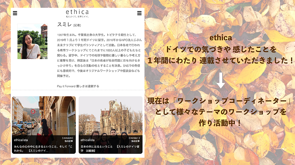 ethica公式ファシリテーターのスミレさんは、大学で国際教養を学ぶ傍ら、文部科学省が展開する「トビタテ!留学JAPAN」の9期生として2019年1月より1年間ドイツへ留学。帰国してからは、スミレさんがドイツで学んだこと、感じたことを「スミレのドイツ留学 回顧録」として、ethicaで語っていただきました。