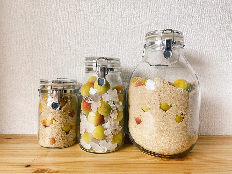 清潔なビンに梅と砂糖を1:1の割合で入れて、1日に数回振って砂糖が溶けて1ヶ月もすれば完成。