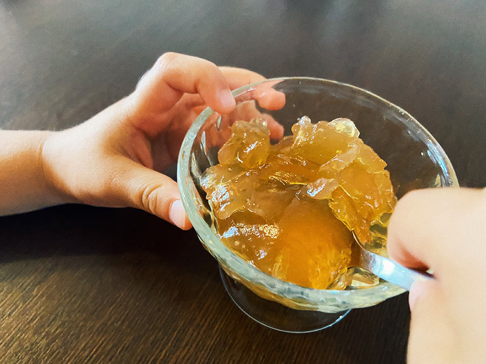 娘と私のお気に入りは、固めておいた寒天をフォークで崩して、そこに梅シロップをかけるだけのお手軽あんみつ風。夏定番のおやつです。