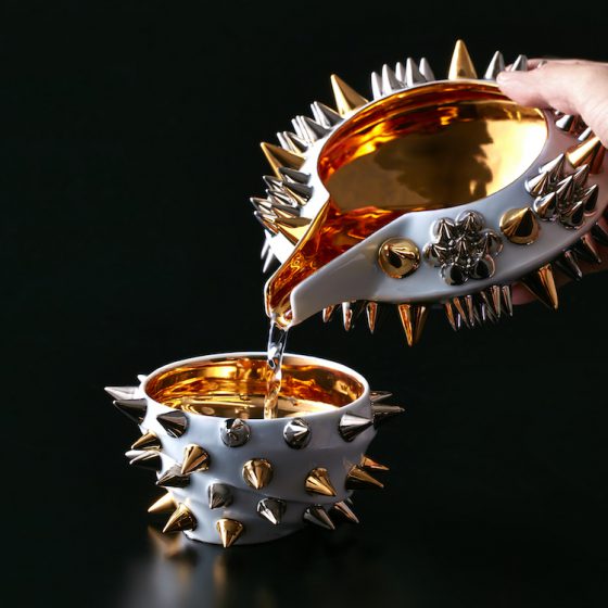 現在、九州を中心に活動している陶芸家・古賀崇洋さんは作品の存在感を際立たせるために「反わびさび」という新しい概念を掲げ、器全体を大小のスタッズ(突起)で覆う派手でユニークなシリーズを展開、質素で静かなものをイメージする日本人の美意識「わびさび」とはかけ離れた作品を発表しています。