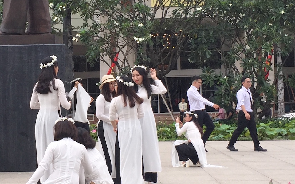 一方、ベトナムでは、アオザイ(アオヤイ)と呼ばれる伝統衣装が街のいたるところで目につきます。それも多様な年齢層の人々が着用しているのです。