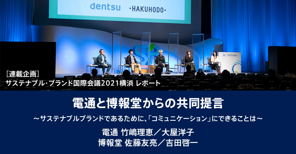 ethicaがメディアパートナーとして参加した「サスティナブル・ブランド国際会議2021横浜」(SB 2021 YOKOHAMA)では多くのセミナー、ディスカッション、ワークショップが繰り広げられ、さまざまな貴重な提言や発表が紹介されました。その中で「電通と博報堂からの共同提言 〜サステナブルブランドであるために、コミュニケーションにできることは〜」と題されたパネルディスカッションでは、サステナブル・ブランド国際会議 アカデミックプロデューサー 青木 茂樹さんをファシリテーターとして、株式会社電通から竹嶋 理恵さん(PRソリューション局 コミュニケーションディレクター / 電通Team SDGs プロジェクトリーダー)と大屋 洋子さん(PRソリューション局 コミュニケーションディレクター/電通 Team SDGs コンサルタント)、株式会社博報堂から佐藤 友亮さん(第五ビジネスデザイン局 部長MDコンサルティング局 マーケットデザインコンサルタント)と吉田 啓一さん(MDコンサルティング局 マーケットデザインコンサルタント)が登壇。今回はその内容をご紹介します。(記者:エシカちゃん)