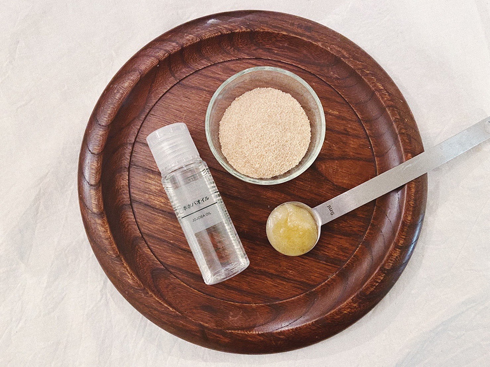 砂糖は普段料理にも使っている粗製糖、オイルは髪の毛の保湿に使っているホホバオイルを使用しています。