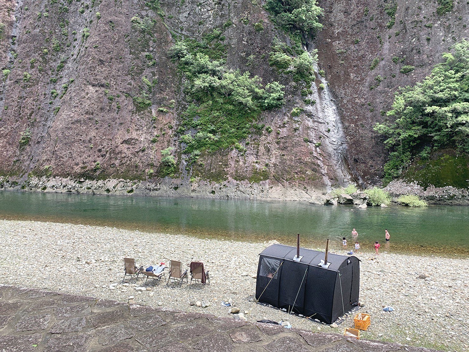 ゆずのアロマオイル入りの水を石にかけると、ジュワーと蒸気が立ち上り、体感温度が一気に上昇します。もう少し香りを楽しみたいけどもう限界……! と葛藤しつつテントを出たら、数メートル先の川へダイブ!