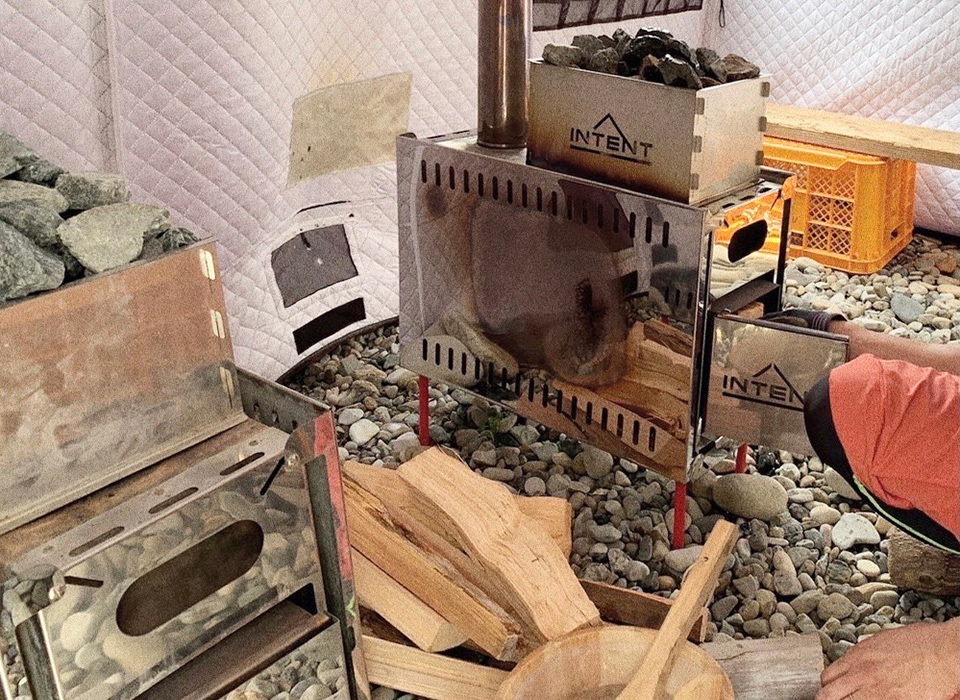 河原に設置されたテントサウナの中に入ると、2台の薪ストーブが焚かれていて、パチパチと薪がはぜる音が聞こえると同時に、ブワッと熱気に包まれます。温度計を見ると、90度を超える熱さ。