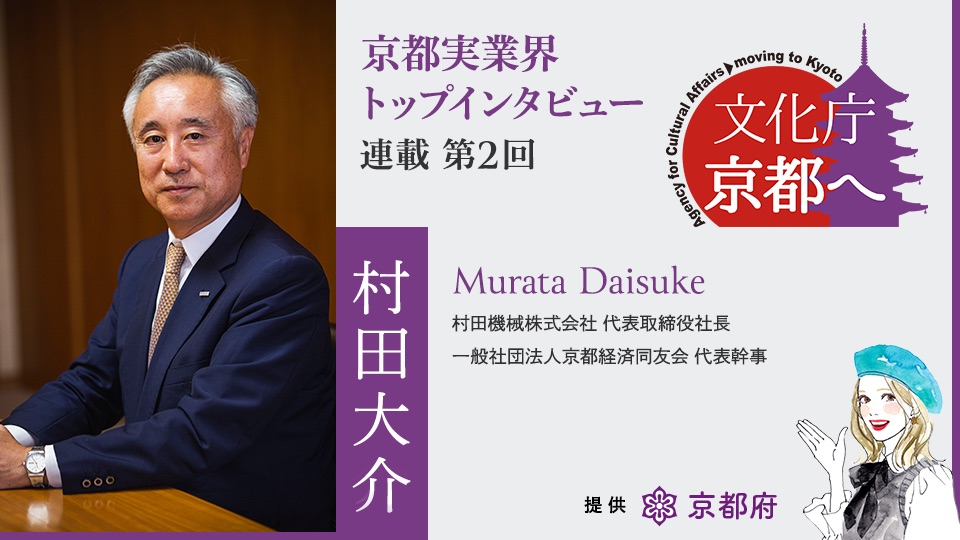国家プロジェクトともいうべき、文化庁の京都への移転。2023年3月27日の新・文化庁の業務開始を目前に、京都に本社を構える企業のトップ達はこの状況をどう受け止め、今後に向けてどのような想いを抱いているのだろうか。ethicaと日経ビジネスの共同企画として、実業界を代表する4人のキーパーソンにインタビューする全4回の連載シリーズ。第2回は、村田機械株式会社の代表取締役社長であり、一般社団法人京都経済同友会の代表幹事である村田大介(むらた・だいすけ)氏にethica編集長の大谷賢太郎(おおたに・けんたろう)がお話を伺った。