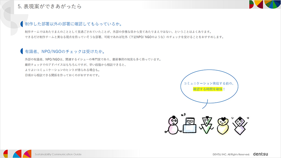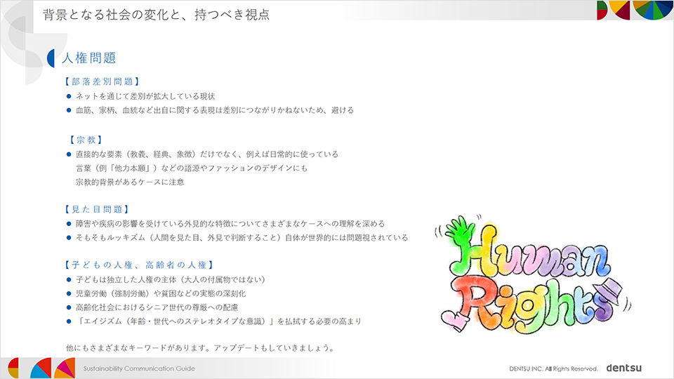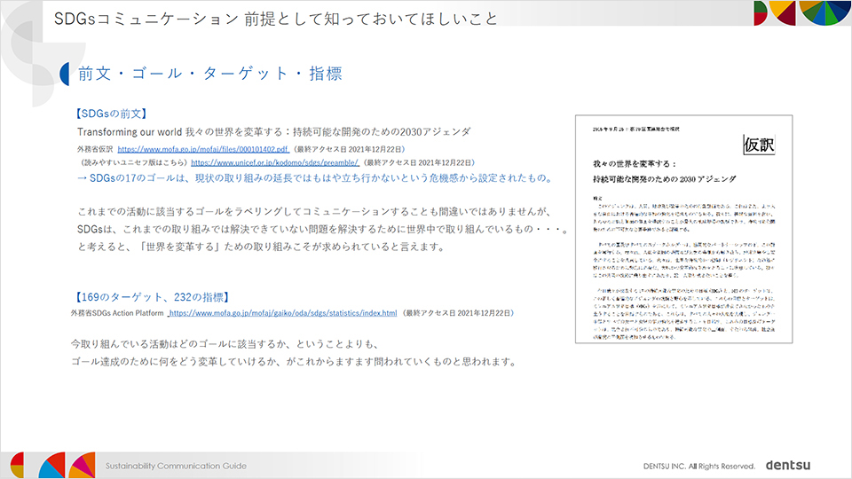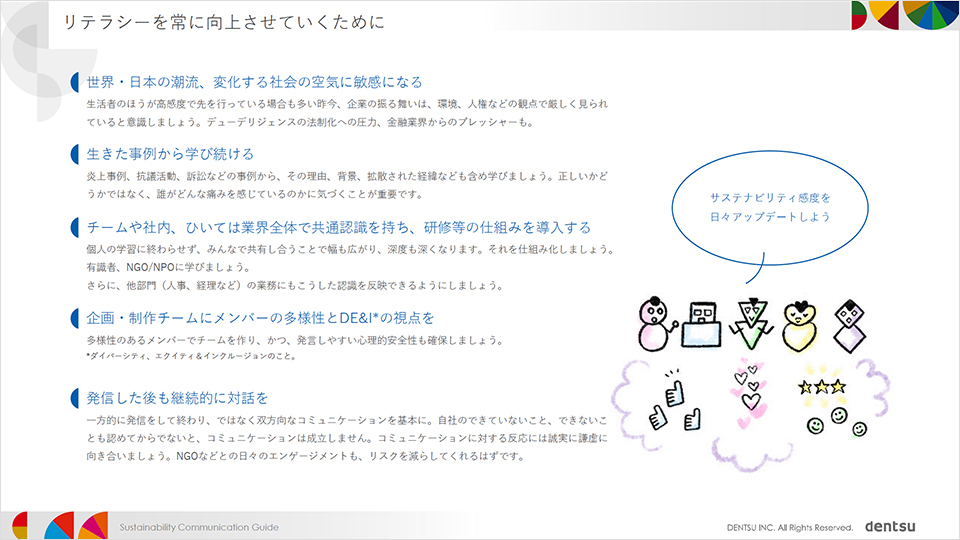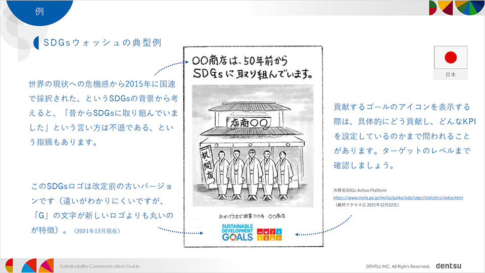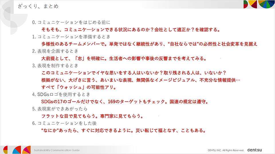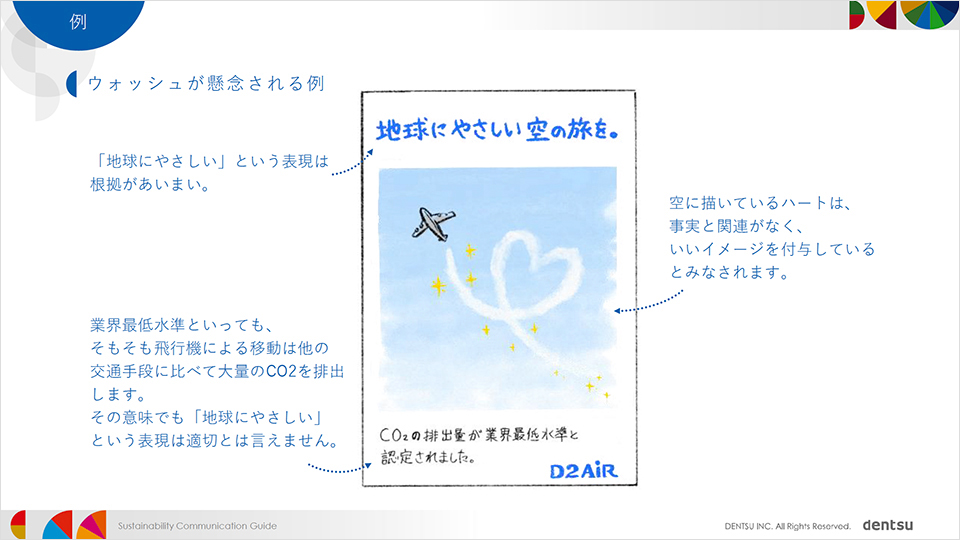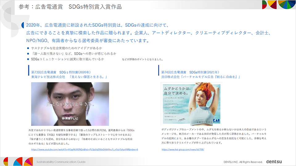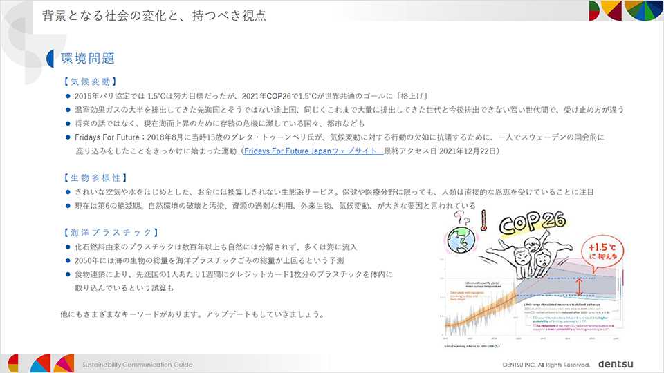 ethicaがメディアパートナーとして参加した「サスティナブル・ブランド国際会議2022横浜」(SB 2022 YOKOHAMA)では多くのセミナー、ディスカッション、ワークショップが繰り広げられ、さまざまな貴重な提言や発表が紹介されました。その中で『真の「サステナブルブランド」のためのコミュニケーションとは 〜電通「サステナビリティ・コミュニケーションガイド」(2021年12月発行)より』と題された講演では、株式会社電通から大屋 洋子さん(PRソリューション局 ソーシャルイノベーション部 チーフディレクター/「電通 Team SDGs」 SDGsコンサルタント)と籠島 康治さん(CXクリエーティブセンター クリエーティブ・ディレクター/ コピーライター「電通 Team SDGs」 SDGsコンサルタント)が登壇。中編に続き、その内容をご紹介します。(記者:エシカちゃん)
