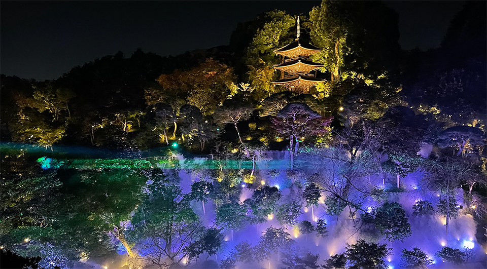 昨年秋にお披露目された庭園の演出「森のオーロラとアニバーサリーフラッシュ」
