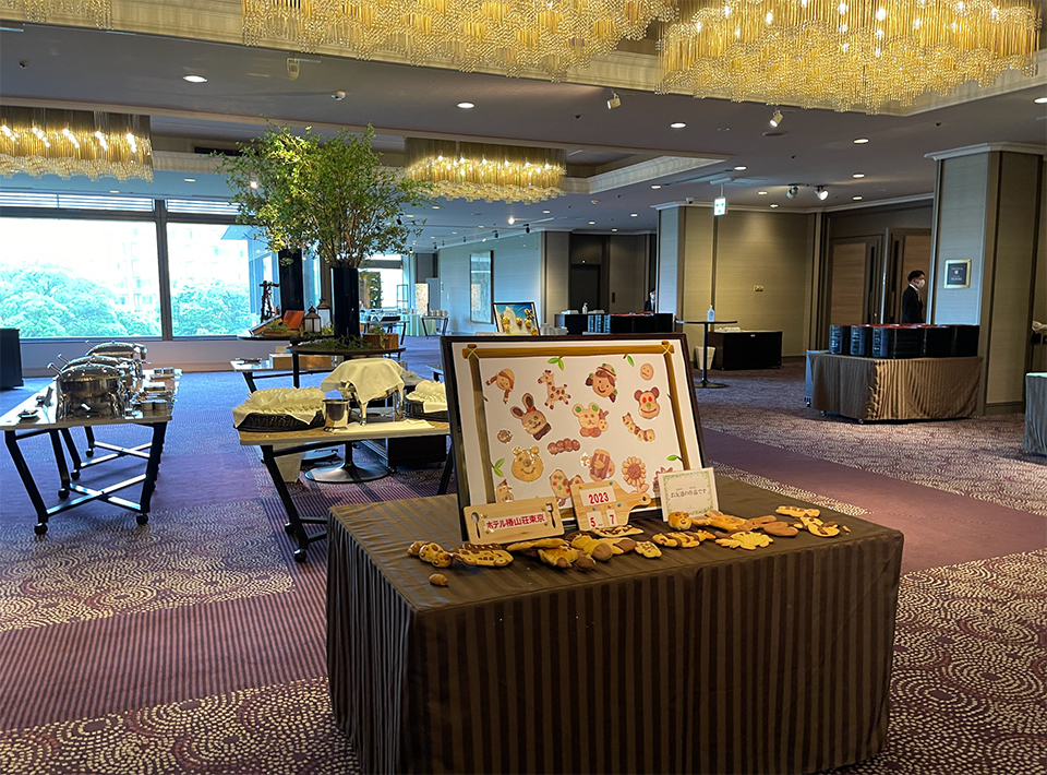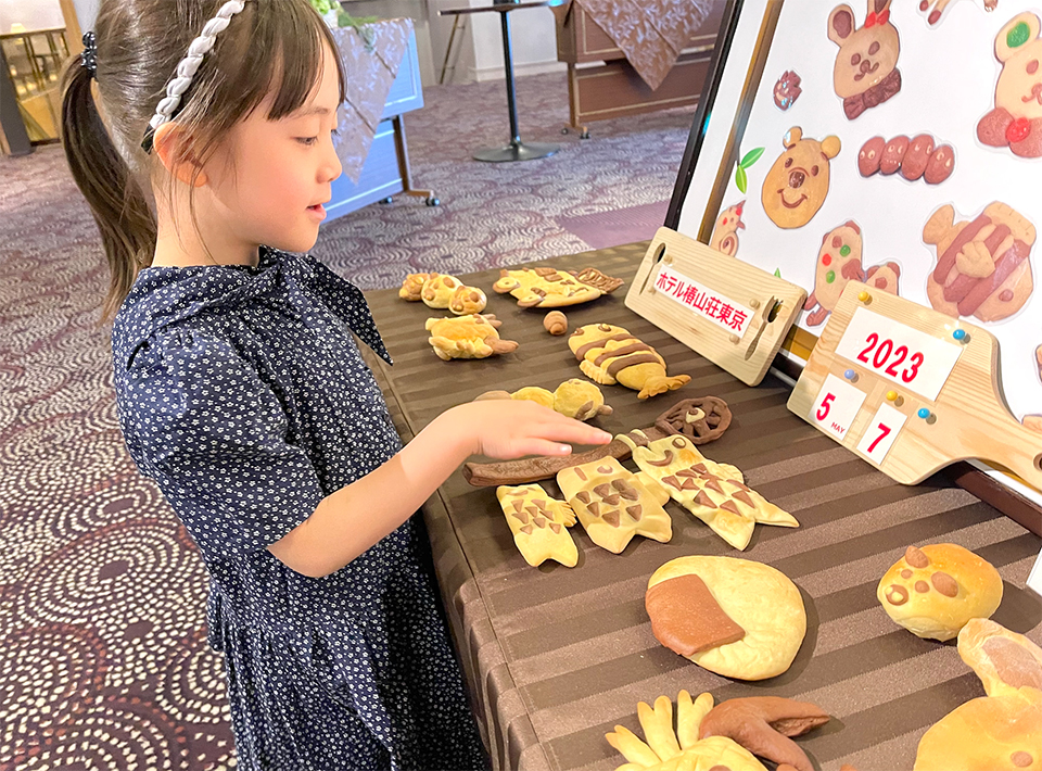 バンケット棟のイベント会場のフロアへ到着すると、ロビーに今回行うパン作りの見本となる完成品が並んでいて思わず駆け寄ります!