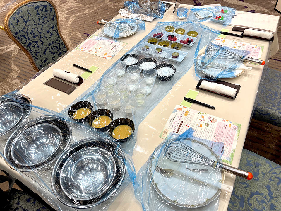 弾む気持ちで会場に入ると、豪華な披露宴が開催できそうな天井の高い広い大広間で、番号がついたテーブルが並べられ、テーブルの上には完璧に料理できる準備がセッティング済みです。作業は講師の先生が前で実演してくれて、左右に並べられた大きなスクリーンが、その手元の様子を映し出してくれる仕様になっています。レシピも各テーブルに添えられているため、段取りについてはバッチリ問題なさそうで安心です。