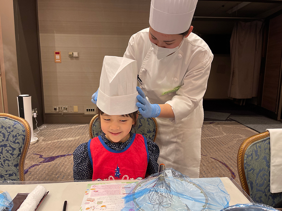 なんと子どもにはパティシエが被るような背の高い白のコック帽が用意されていて、サポートしてくれるスタッフの方が、あむんに被せてくれました!まるでプロのような姿になれて、気分が一気に盛り上がります!