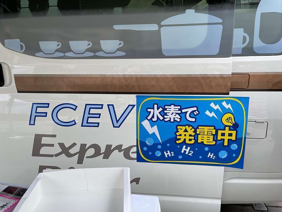 たくさん遊んで、またお腹が空いてきたので、フードを販売しているキッチンカーへ行ってみます。近づいてみると、車の脇には「水素で動くキッチンカー」との看板が。車体には、水素で発電中!と書かれたステッカーが貼られています。
