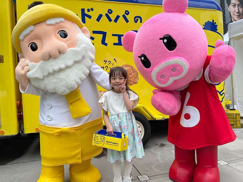 帰りかけているところにTBSのマスコットキャラクター・ブーナちゃんと、シュークリームで有名なビアードパパを発見!あむんは、写真を撮りたい!と駆け寄ります。