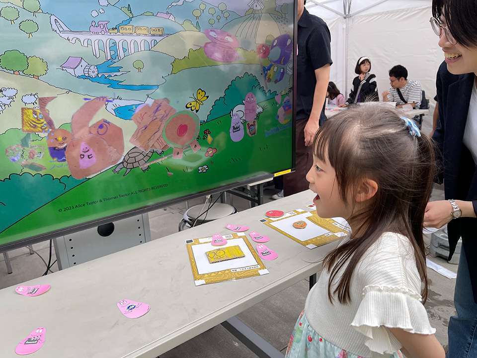 最後にもう一ヶ所だけ!ということで、あむんは大好きなバーバパパのブースへ。ここでは余っている段ボールに絵を描きスキャンすることで、自分が描いたその絵がモニター上のバーバパパたちの世界に登場するという遊びの体験ができるのだとか。