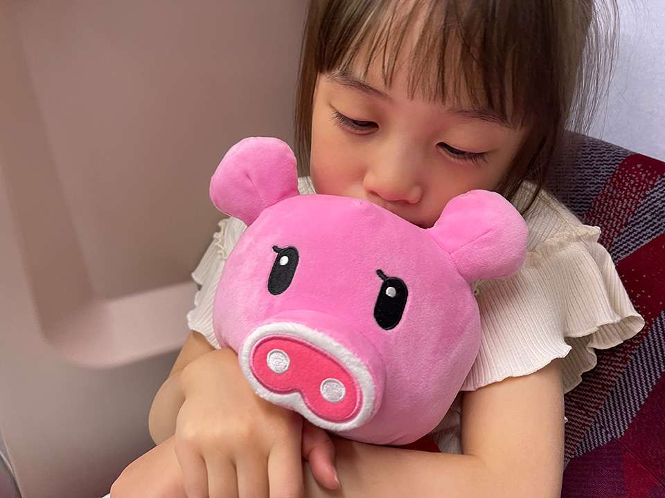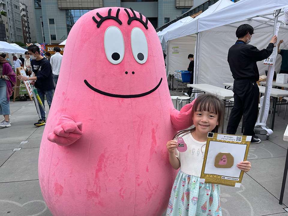 モニター前でワァワァと興奮しているところにバーバパパもやってきてくれて、ますます大喜び。記念に一緒に写真を撮って、最後にはステッカーももらってお別れしました。