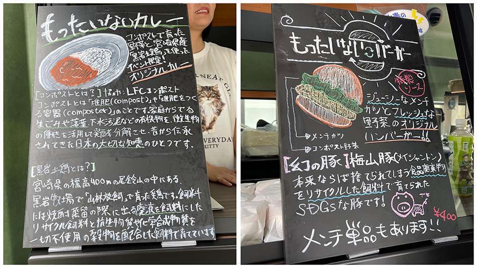 そんなキッチンカーで販売されているのは「もったいないバーガー」と「もったいないカレー」!食品廃棄物をリサイクルした肥料で育った鶏や、コンポストの土で育った野菜などが食材として使用されており、フードロス削減にも寄与しています。素材ひとつひとつにこだわって自信を持って提供している様子が伺えます。
