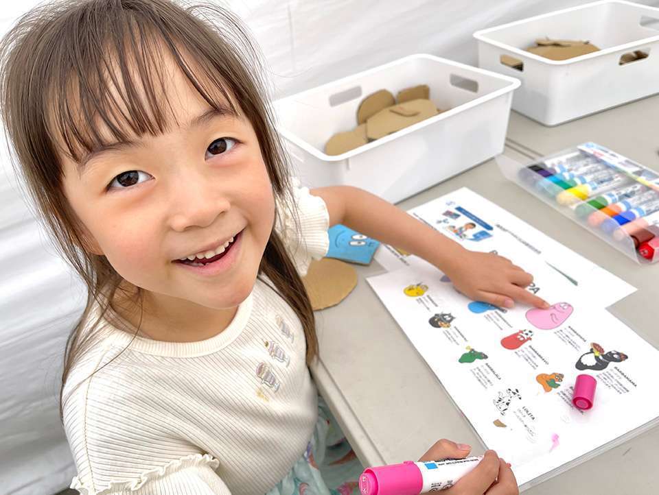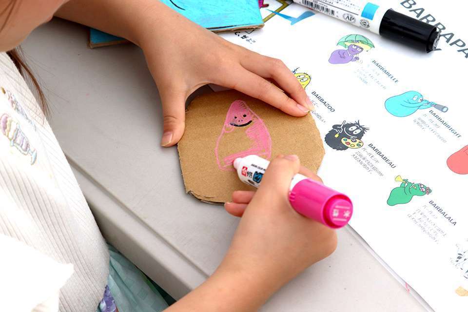 あむんは「うまくかけるかなぁ?」とちょっとドキドキしながら段ボールとカラーペンを選んで、バーバパパの絵を描いていきます。