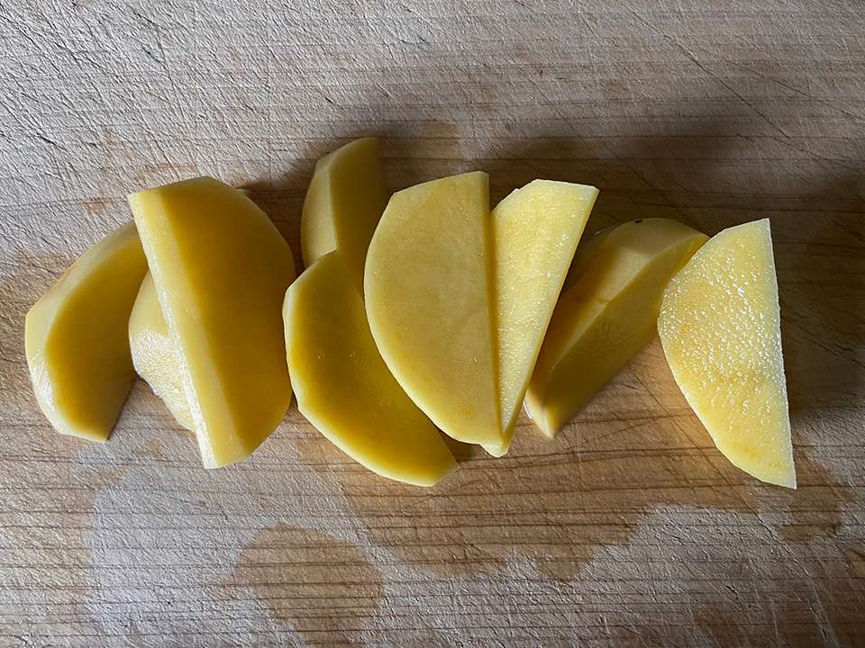 じゃがいもは芽を取って皮をむき(新じゃがの場合は皮付きがおすすめ)、くし切りにする。