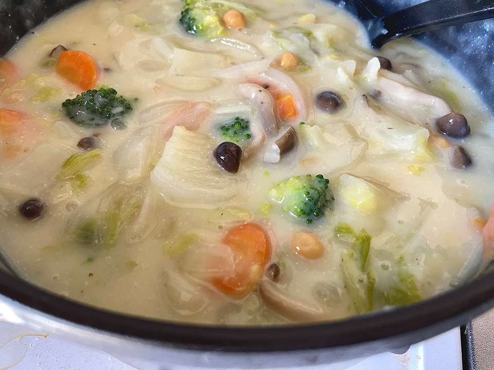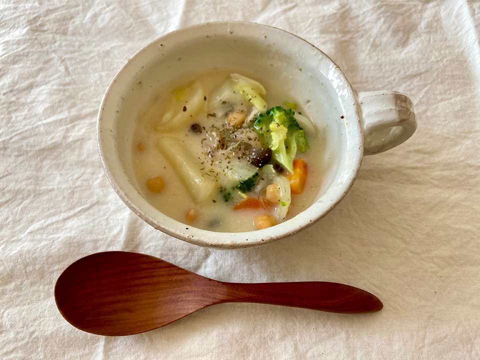ホワイトソースからつくる本格的なクリームシチューには敵わないかもしれないけれど、ふと「今日はあったかいシチューが食べたいな〜」という日に、冷蔵庫にあるものでスープをつくるような気持ちで、手軽に料理に取りかかれるレシピになっています。