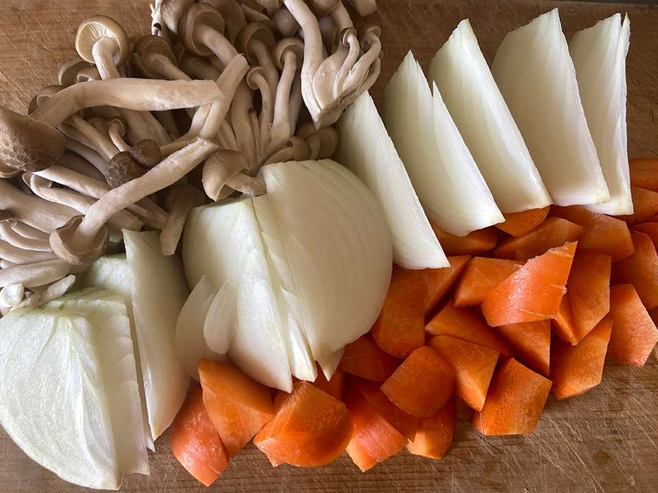 ① 玉ねぎ、人参、じゃがいもは洗って皮をむき、一口大に切る。きのこは軸をとっておく。白菜は一口大に切る。