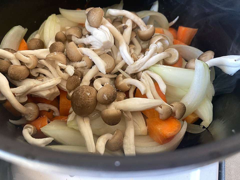 ② 厚手の鍋に油を熱し、玉ねぎ、人参、きのこ、じゃがいも、白菜の順に加えながら炒める。