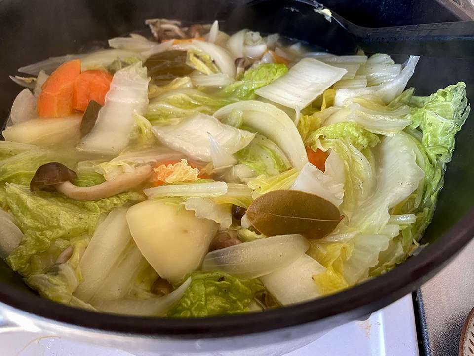 ③ 白菜に油が馴染んだら、水を加え、野菜コンソメとローリエを入れて煮る。沸騰したら火を弱め、10分ほどくつくつ煮込む。