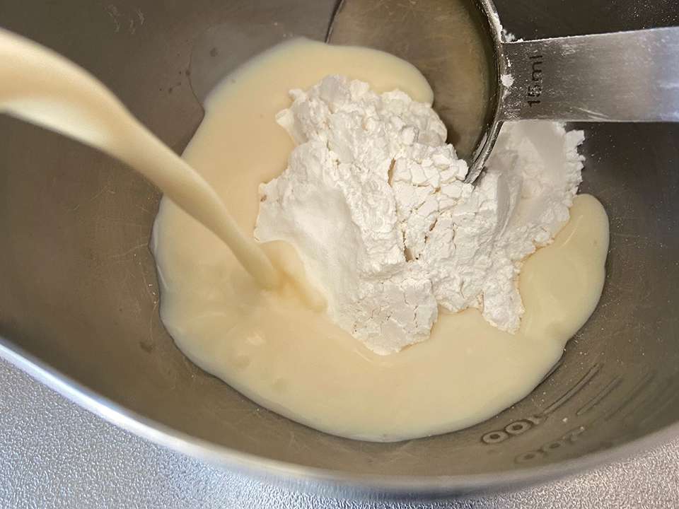 ⑤ 無調整豆乳100ccに米粉大さじ4を入れてダマがなくなるまでしっかり混ぜる。