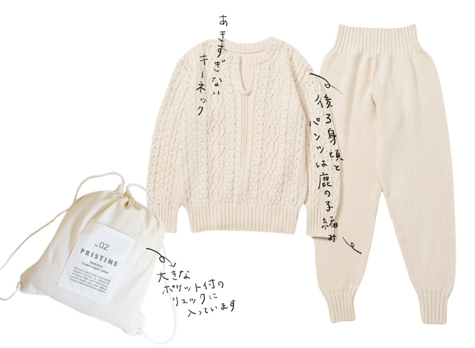 ケーブル編みと鹿の子編みを組み合わせたキーネックのセーターと鹿の子編みのニットパンツのセット。限定のナップサックに入れてお届けします。