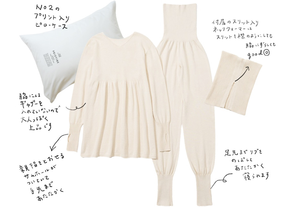 Vネックのギャザープルオーバーとネックウォーマー、足先もすっぽり覆えるパンツをセットにしました。枕カバーとしても使えるオーガニックコットンの袋付きです。