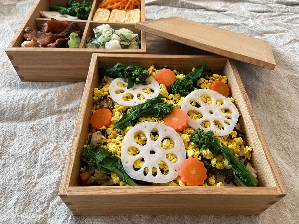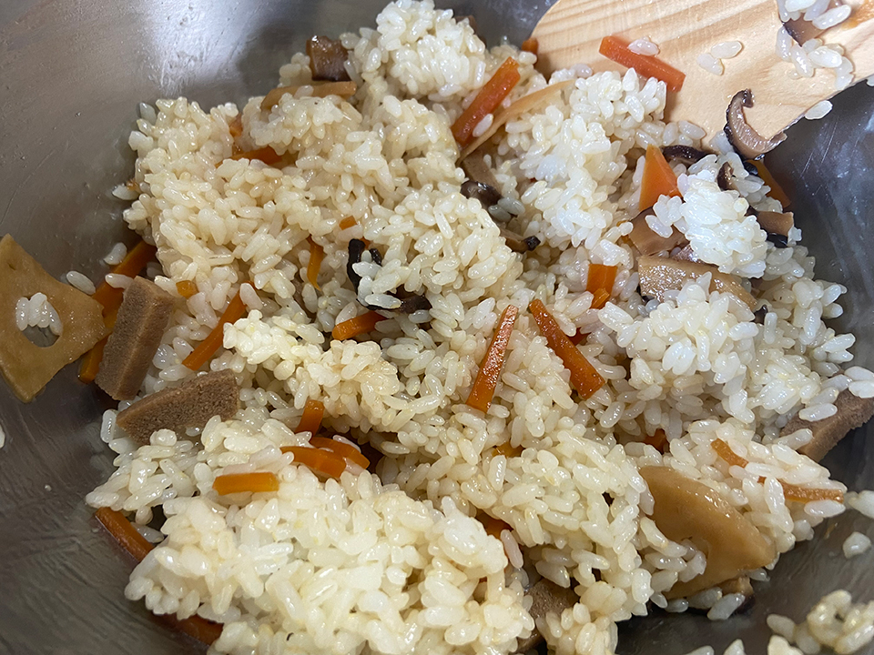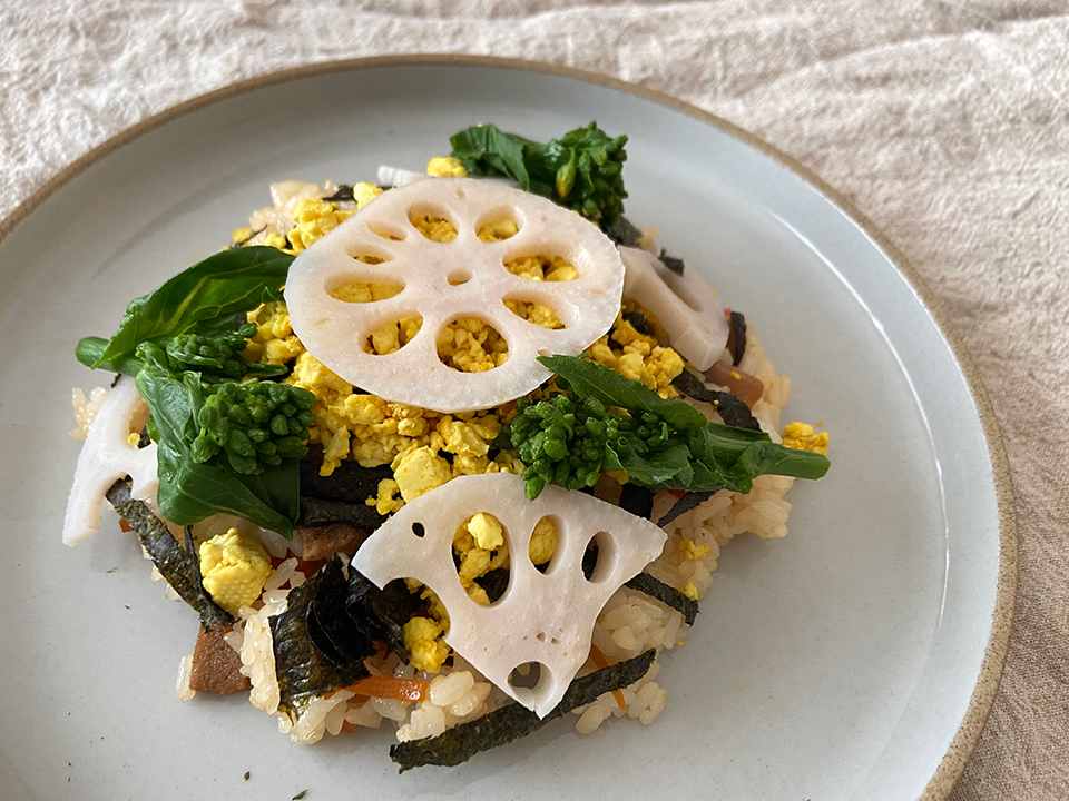 炊きたてご飯にさっくり混ぜ込んで、菜の花やスナップエンドウ、れんこん、型抜きした人参など彩り豊かな春の素材を飾ると、一気に食卓も華やかに。