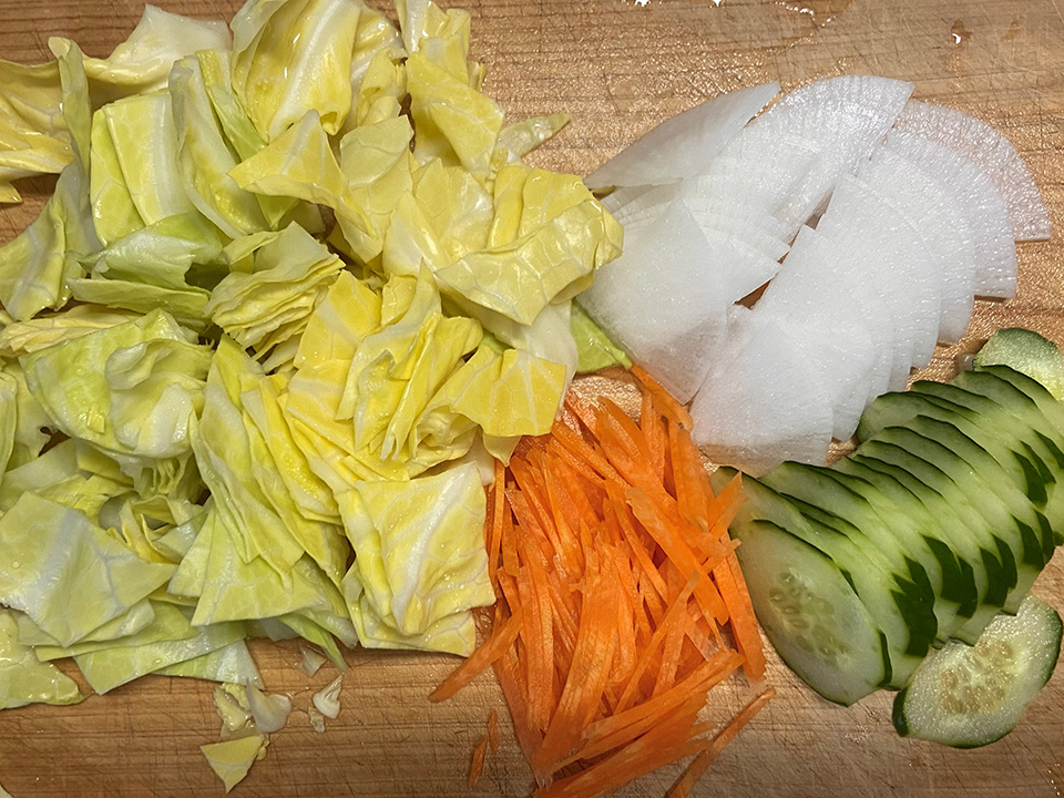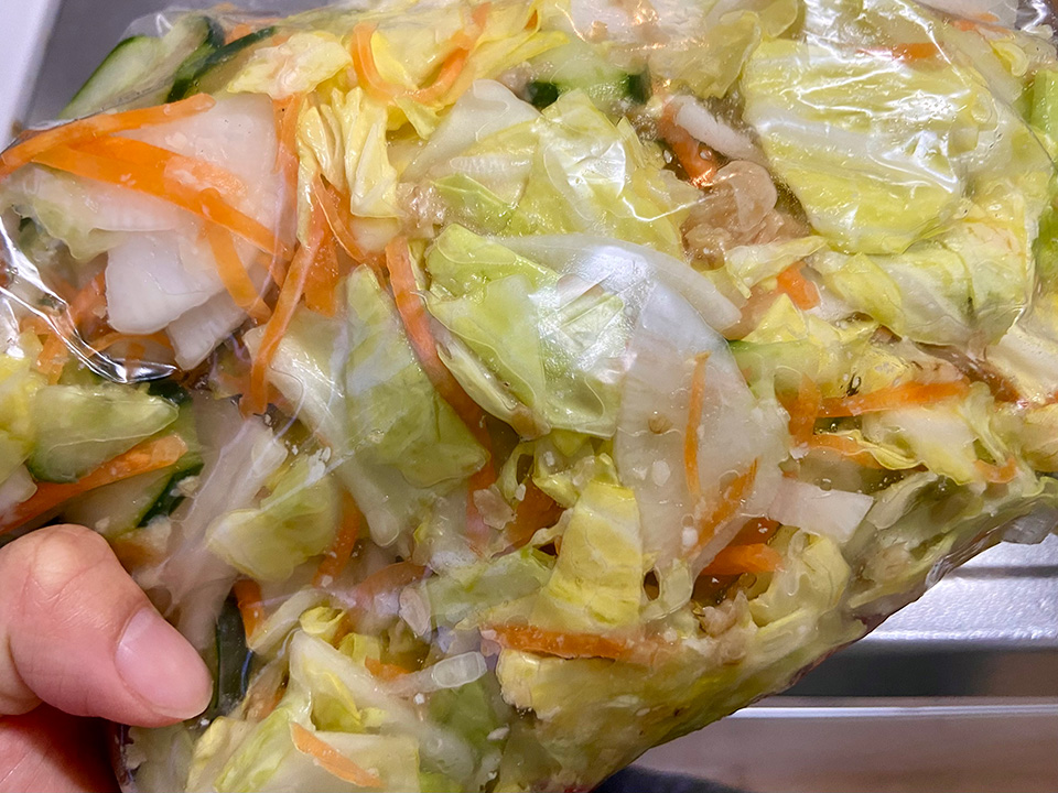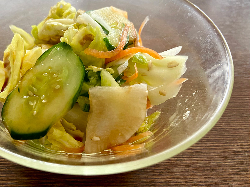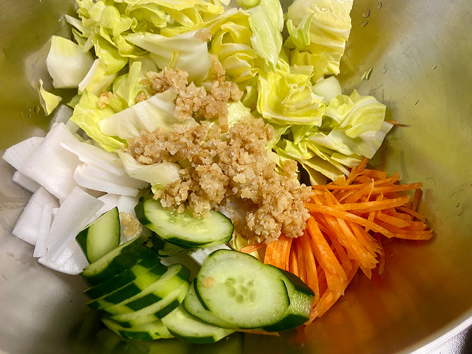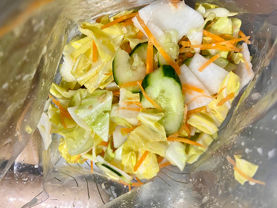 作り方は食べやすい大きさに切ったキャベツ、大根、人参を基本に、季節によってきゅうりやナス、みょうがなども加えて塩麹でざっくり和えるだけ、という至ってシンプルなものですが、塩麹で浅漬けにすることでカサは減りつつ旨味は増すので、普段多くは食べ辛い生野菜のビタミンやミネラル、食物繊維をまるっと豊富に摂ることも期待できます。